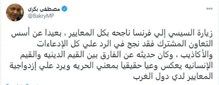 وقال في تغريدة عبر "تويتر" رصدها "المشهد العربي": "زيارة السيسي إلي فرنسا ناجحة بكل المعايير، بعيدًا عن أسس التعاون المشترك فقد نجح في الرد علي كل الإدعاءات والأكاذيب".