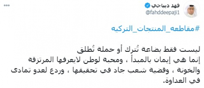 وأضاف في تغريدة على حسابه بموقع التدوين المصغر (تويتر)، اليوم، أن: " مقاطعة المنتجات التركية ليست فقط بضاعة تُترك أو حملة تُطلق إنما هي إيمان بالمبدأ، ومحبة لوطن لايعرفها المرتزقة والخونة، وقضية شعب جاد في تحقيقها، وردع لعدو تمادى في العداوة".
