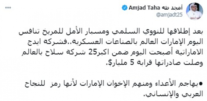 وقال في تغريدة على حسابها بموقع التدوين المصغر (تويتر)، اليوم، إن: "بعد إطلاقها للنووي السلمي ومسبار الأمل للمريخ تنافس اليوم الإمارات العالم بالصناعات العسكرية".