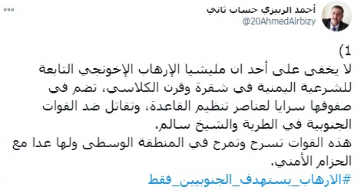 وأكد في تغريدة على حسابه بموقع التدوين المصغر (تويتر)، اليوم، أنه: "لا يخفى على أحد أن مليشيا الإرهاب الإخونجي التابعة للشرعية اليمنية في شقرة وقرن الكلاسي، تضم في صفوفها سرايا لعناصر تنظيم القاعدة، وتقاتل ضد القوات الجنوبية في الطرية والشيخ سالم".
