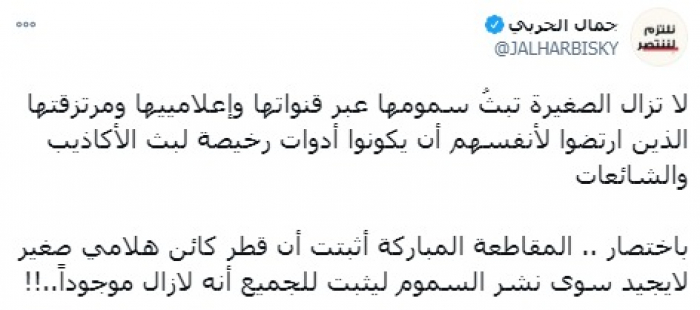 وقال في تغريدة على حسابه بموقع التدوين المصغر (تويتر)، اليوم، إنه: "لا تزال الصغيرة تبثُ سمومها عبر قنواتها وإعلامييها ومرتزقتها الذين ارتضوا لأنفسهم أن يكونوا أدوات رخيصة لبث الأكاذيب والشائعات باختصار".