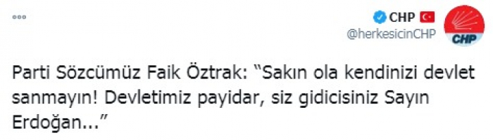 ونشر الحساب الرسمي للحزب في تغريدة على حسابه بموقع التدوين المصغر (تويتر)، تصريحات لمتحدث الحزب، اليوم، قال فيها: "لا تفترض أنك الدولة، دولتنا بارزة، لكن أنت سترحل سيد أردوغان".