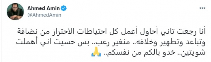 وكتب "أمين" تغريدة، عبر حسابه بموقع "تويتر": " أنا رجعت تاني أحاول أعمل كل احتياطات الاحتراز من نضافة وتباعد وتطهير وخلافه.. من غير رعب.. بس حسيت إني أهملت شويتين.. خدو بالكم من نفسكم".