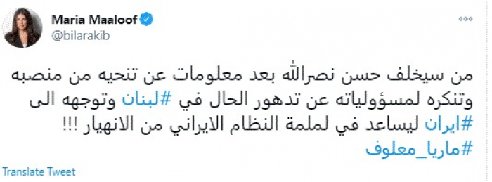 ألمحت الإعلامية اللبنانية ماريا معلوف، اليوم، إلى اقتراب الأمين العام لحزب الله عن تنحيه من منصبه وتوجهه إلى إيران.