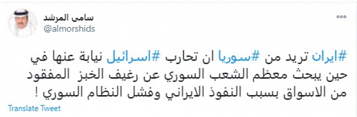وقال في تغريدة عبر "تويتر" رصدها "المشهد العربي": "إيران تريد من سوريا أن تحارب إسرائيل نيابة عنها في حين يبحث معظم الشعب السوري عن رغيف الخبز المفقود من الأسواق بسبب النفوذ الايراني وفشل النظام السوري".