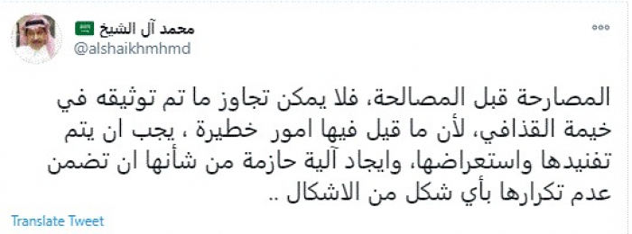 وقال في تغريدة عبر "تويتر" رصدها "المشهد العربي": "المصارحة قبل المصالحة، فلا يمكن تجاوز ما تم توثيقه في خيمة القذافي، لأن ما قيل فيها أمور خطيرة ، يجب ان يتم تفنيدها واستعراضها، وايجاد آلية حازمة من شأنها أن تضمن عدم تكرارها بأي شكل من الاشكال".