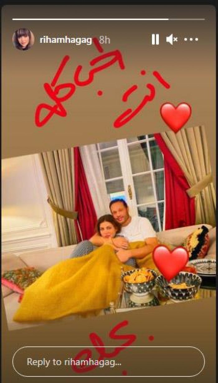 نشرت الفنانة ريهام حجاج صورة تجمعها بزوجها رجل الأعمال محمد حلاوة من داخل منزلهما، عبر خاصية "القصص القصيرة"، خلال حسابها بموقع "إنستجرام".