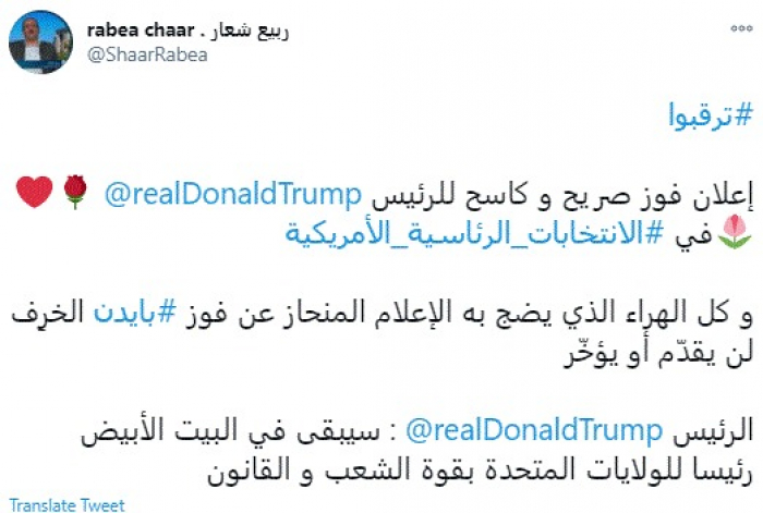 وكتب في تغريدة عبر "تويتر" رصدها "المشهد العربي": "ترقبوا إعلان فوز صريح و كاسح للرئيس ترامب في الانتخابات الرئاسية الأمريكية وكل الهراء الذي يضج به الإعلام المنحاز عن فوز بايدن الخرِف لن يقدّم أو يؤخّر".
