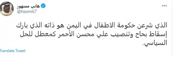 وقال في تغريدة عبر "تويتر" رصدها "المشهد العربي": "الذي شرعن حكومة الاطفال في اليمن هو ذاته الذي بارك إسقاط بحاح وتنصيب علي محسن الأحمر كمعطل للحل السياسي".