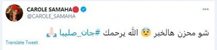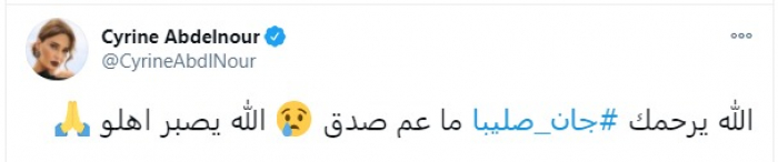 بينما كتبت سيرين عبد النور عبر "تويتر": "الله يرحمك جان صليبا.. ما عم صدق.. الله يصبر أهله".