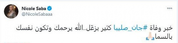 كما كتبت نيكول سابا عبر "تويتر": "خبر وفاة جان صليبا كتير بزعّل.. الله يرحمك وتكون نفسك بالسما".