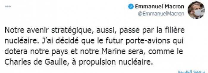 وكشف عن قراره بأن: "حاملة الطائرات المستقبلية التي ستجهز لبلدنا وبحريتنا، مثل شارل ديغول، ستعمل بالطاقة النووية".