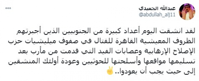 كشف الشاعر عبدالله الجعيدي، عن انشقاق جنود جنوبيين من صفوف مليشيا الإصلاح الإرهابية، الذين أجبرتهم الظروف الاقتصادية على الانضمام إليها.