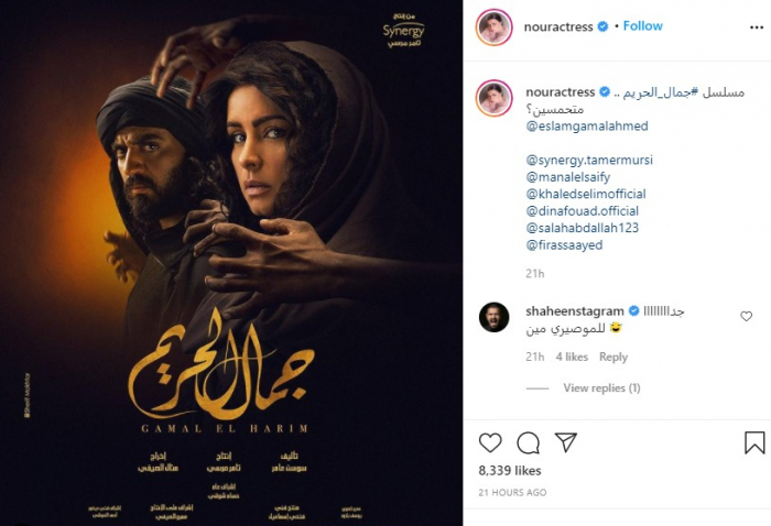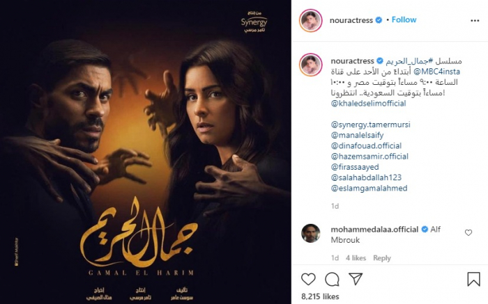 ونشرت "نور"، صورة لبوستر المسلسل ظهرت خلاله رفقة الفنان خالد سليم، وعلقت: "مسلسل جمال الحريم أبتداءً من الأحد على قناة MBC4insta الساعة ٩:٠٠ مساءا بتوقيت مصر و١٠:٠٠ مساءا بتوقيت السعودية.. انتظرونا".