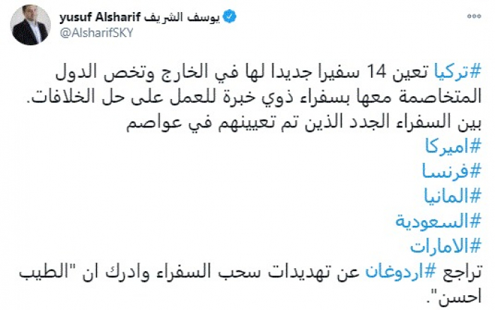 وقال في تغريدة عبر "تويتر" رصدها "المشهد العربي": "تركيا تعين 14 سفيرا جديدا لها في الخارج وتخص الدول المتخاصمة معها بسفراء ذوي خبرة للعمل على حل الخلافات. بين السفراء الجدد الذين تم تعيينهم في عواصم أمريكا وفرنسا وألمانيا والسعودية والإمارات وتراجع أردوغان عن تهديدات سحب السفراء وأدرك أن ألطيب أحسن".