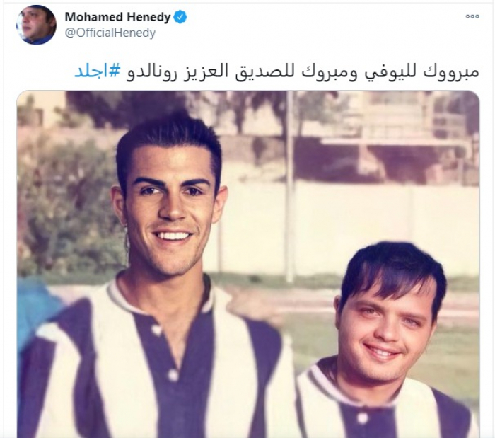 وبصورة طريفة معدلة على طريقة الـ"فوتوشوب"، نشر هنيدي صورته رفقة "رونالدو"، وعلق عليها: "مبروك لليوفي ومبروك للصديق العزيز رونالدو اجلد".