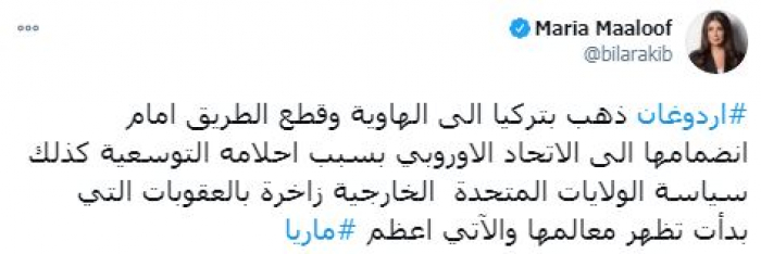 أكدت الإعلامية اللبنانية ماريا معلوف، أن سياسة الرئيس التركي رجب طيب أردوغان التوسعية، قطعت الطريق أمام انضمام بلاده للاتحاد الأوروبي.