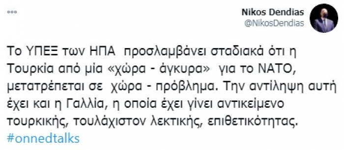 قال وزير خارجية اليونان، نيكوس دندياس، إن هناك اتفاق بين التصور الأمريكي والفرنسي لتركيا كدولة تمثل إشكالية لحلف الناتو.
