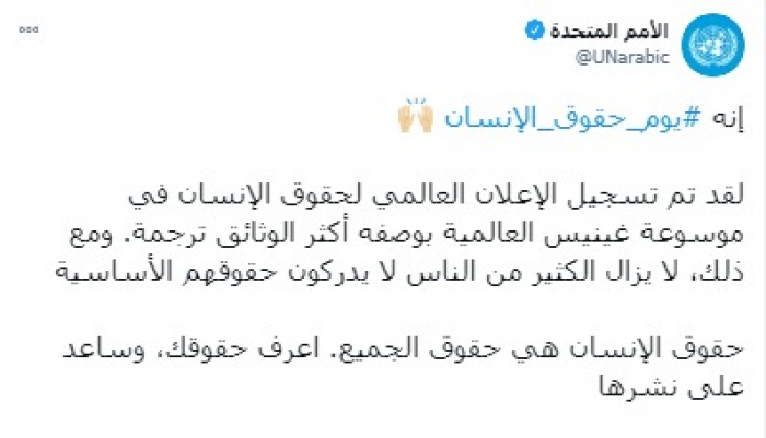 وقالت "الأمم المتحدة" في تغريدة عبر حسابها الرسمي بتويتر، "رصدها "المشهد العربي": "إنه يوم حقوق الإنسان، لقد تم تسجيل الإعلان العالمي لحقوق الإنسان في موسوعة غينيس العالمية بوصفه أكثر الوثائق ترجمة".