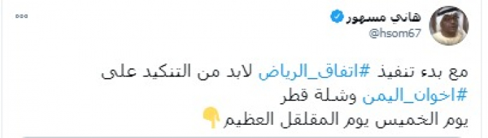 وكتب "مسهور" تغريدة عبر حسابه بتويتر، رصدها "المشهد العربي": " مع بدء تنفيذ اتفاق الرياض لابد من التنكيد على إخوان اليمن وشلة قطر، يوم الخميس يوم المقلقل العظيم".