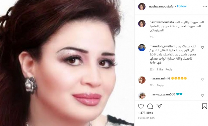 ونشرت نشوى صورة للفنانة إلهام شاهين، عبر حسابها بموقع "إنستجرام"، وعلقت: "ألف مبروك يا إلهام ألف ألف مبروك، أحسن ممثلة مهرجان القاهرة السينمائي".