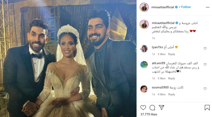 ونشر مينا صورة تجمعه بالعروس، عبر حسابه بموقع "إنستجرام"، وعلق: "أحلى عروسة وعريس والله العظيم، ربنا يحفظكم ويخليكم لبعض".