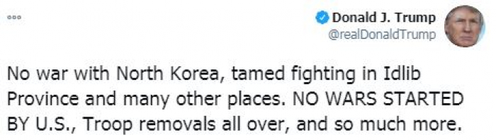 وقال في تغريدة على حسابه بموقع التدوين المصغر (تويتر)، إنه: "لا حرب مع كوريا الشمالية، وتحجيم العمليات العسكرية في محافظة إدلب السورية، والعديد من الأماكن الأخرى".