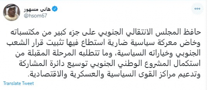 وكتب في تغريدة عبر "تويتر" رصدها "المشهد العربي": "حافظ المجلس الانتقالي الجنوبي على جزء كبير من مكتسباته وخاض معركة سياسية ضارية استطاع فيها تثبيت قرار الشعب الجنوبي وخياراته السياسية".