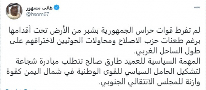 وكتب في تغريدة عبر "تويتر" رصدها "المشهد العربي": "لم تفرط قوات حراس الجمهورية بشبر من الأرض تحت أقدامها برغم طعنات حزب الإصلاح ومحاولات الحوثيين لاختراقهم على طول الساحل الغربي".