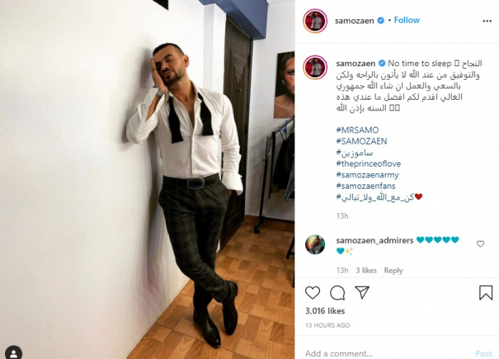 وكتب سامو زين، عبر حسابه على إنستجرام : "النجاح والتوفيق من عند الله، لا يأتون بالراحة، ولكن بالسعي والعمل.. إن شاء الله جمهوري الغالي.. أُقدم لكم أفضل ما عندي هذه السنة بإذن الله".