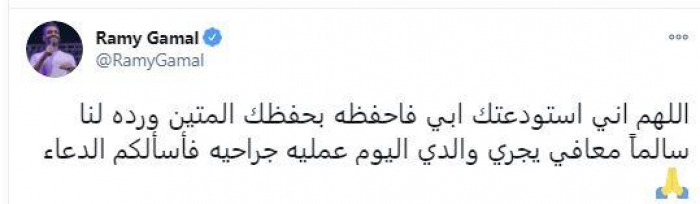 وكتب رامي، عبر حسابه على تويتر، قائلاً: "اللهم اني استودعتك أبي، فاحفظه بحفظك المتين، ورده لنا سالمًا معافى، يُجري والدي اليوم عملية جراحية.. فأسألكم الدعاء".