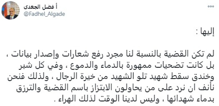 وكتب في تغريدة عبر "تويتر" رصدها "المشهد العربي": "لم تكن القضية بالنسبة لنا مجرد رفع شعارات وإصدار بيانات، بل كانت تضحيات ممهورة بالدماء والدموع، وفي كل شبر وخندق سقط شهيد تلو الشهيد من خيرة الرجال".