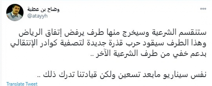 وقال في تغريدة عبر "تويتر" رصدها "المشهد العربي": "ستنقسم الشرعية وسيخرج منها طرف يرفض اتفاق الرياض وهذا الطرف سيقود حرب قذرة جديدة لتصفية كوادر الانتقالي بدعم خفي من طرف الشرعية الآخر".