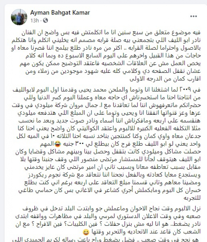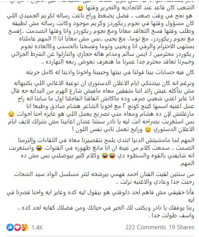 وأضاف: "المهم لما ما مشيتش الدنيا، ابتدى يلمح بتقصيرنا معاه في اللقاءات، وإلتزمنا الصمت.. سمعت كلام من عينة إن أنا مانع ظهوره في القنوات.. واستغربت أنه شايفني بالقوة والسطوة دي.. وكلام كتير بيوصلني بس مش ده المهم.. من سنتين لقيت الفنان أحمد فهمي بيرشحه لتتر مسلسل (الواد سيد الشحات)..رحبت جدًا وعادي والأغنية نزلت.. فأنا حقيقي مش فاهم لحد دلوقتي هو بيقول ليه كده، وعايز إيه؟ وإحنا قصرنا في إيه؟.. ربنا يوفقك يا "نادر"، ويكتب لك الخير في حياتك، ومن فضلك كفاية لحد كده".