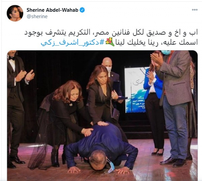 ونشرت شيرين، صورة أشرف زكي وهو يسجد على خشبة المسرح، عبر حسابها على تويتر، وعلقت: "أب وأخ وصديق لكل فنانين مصر.. التكريم يتشرف بوجود اسمك عليه، ربنا يخليك لينا يا دكتور أشرف زكي".