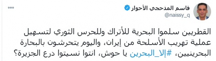 وقال في تغريدة عبر "تويتر" رصدها "المشهد العربي": "القطريين سلموا البحرية للأتراك وللحرس الثوري لتسهيل عملية تهريب الأسلحة من إيران، واليوم يتحرشون بالبحارة البحرينيين، إلا البحرين يا ...، أنتوا نسيتوا درع الجزيرة؟".
