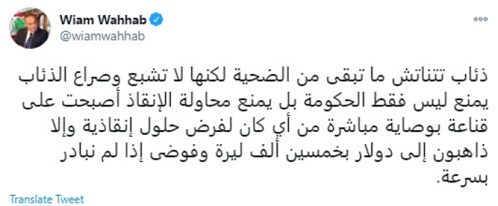 وقال في تغريدة عبر "تويتر" رصدها "المشهد العربي": "ذئاب تتناتش ما تبقى من الضحية لكنها لا تشبع وصراع الذئاب يمنع ليس فقط الحكومة بل يمنع محاولة الإنقاذ أصبحت على قناعة بوصاية مباشرة من أي كان لفرض حلول إنقاذية وإلا ذاهبون إلى دولار بخمسين ألف ليرة وفوضى إذا لم نبادر بسرعة".