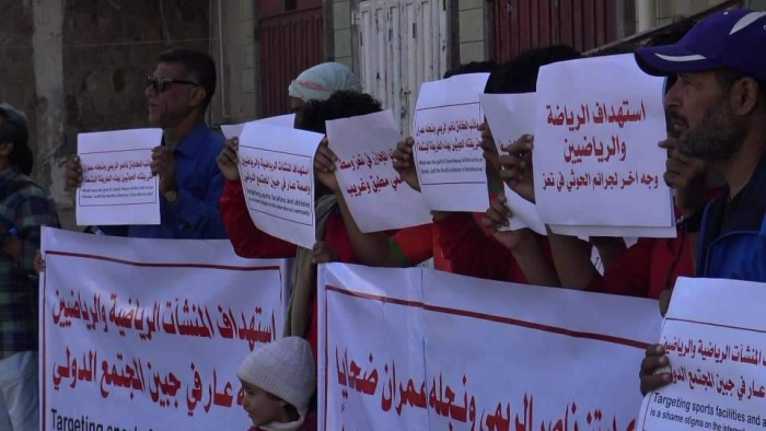 ندد رياضيو نادي أهلي تعز، خلال وقفة احتجاجية اليوم الأحد، بقصف مليشيا الحوثي الإرهابية النادي، الذي أسفر عن استشهاد لاعب نادي الطليعة السابق، المدرب بالنادي الأهلي ناصر محسن ونجله عمران.