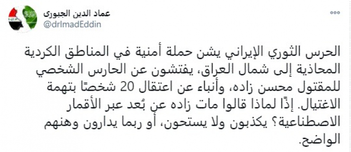 وكتب في تغريدة عبر "تويتر" رصدها "المشهد العربي": "الحرس الثوري الإيراني يشن حملة أمنية في المناطق الكردية المحاذية إلى شمال العراق، يفتشون عن الحارس الشخصي للمقتول محسن زاده، وأنباء عن اعتقال 20 شخصًا بتهمة الاغتيال".