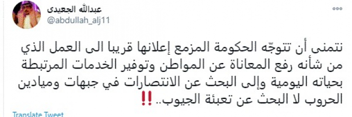 وقال في تغريدة عبر "تويتر" رصدها "المشهد العربي": "نتمنى أن تتوجّه الحكومة المزمع إعلانها قريبًا الى العمل الذي من شأنه رفع المعاناة عن المواطن وتوفير الخدمات المرتبطة بحياته اليومية وإلى البحث عن الانتصارات في جبهات وميادين الحروب لا البحث عن تعبئة الجيوب".