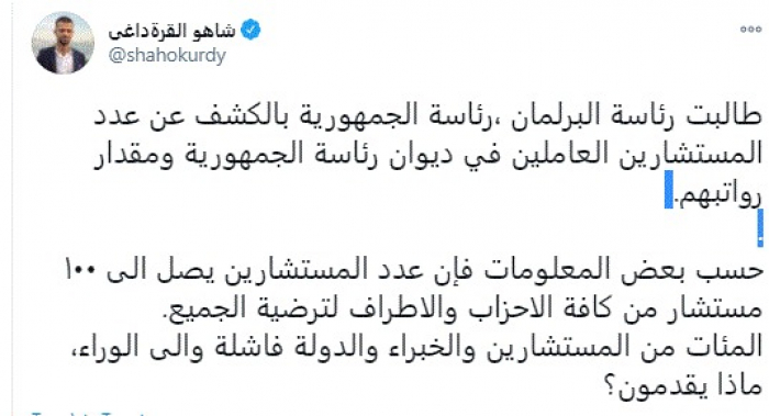 استنكر الكاتب الصحفي العراقي شاهو القرةداغي، اليوم، زيادة أعداد المستشارين العاملين بالمؤسسات الكبرى في الدولة العراقية.
