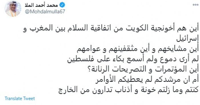 وقال في تغريدة عبر "تويتر" رصدها "المشهد العربي": "أين هم أخونجية الكويت من اتفاقية السلام بين المغرب وإسرائيل أين مشايخهم و أين مثقفينهم و عوامهم لم أرى دموع ولم أسمع بكاء على فلسطين أين المؤتمرات والتصريحات الرنانة؟".