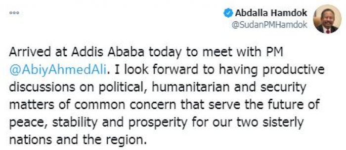 كشف رئيس الوزراء السوداني عبدالله حمدوك، عن الملفات التي حملها خلال زيارته اليوم الأحد، العاصمة الإثيوبية أديس أبابا.