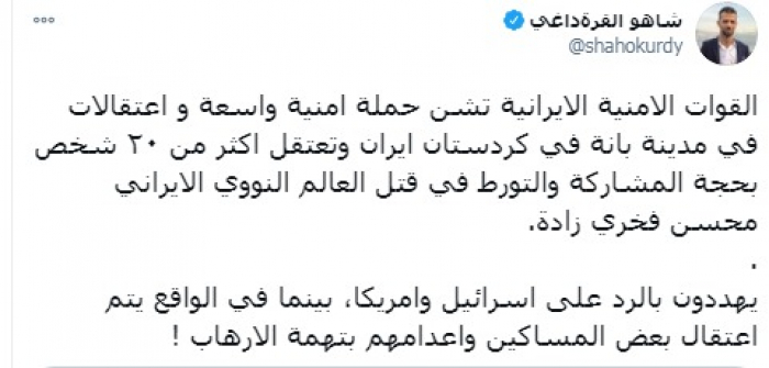 وقال في تغريدة على حسابه بموقع التدوين المصغر (تويتر)، اليوم، إن: "القوات الأمنية الإيرانية تشن حملة أمنية واسعة واعتقالات في مدينة بانة في كردستان إيران، وتعتقل أكثر من ٢٠ شخصًا بحجة المشاركة والتورط في قتل العالم النووي الإيراني محسن فخري زادة".