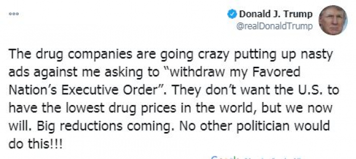 وقال في تغريدة على حسابه بموقع التدوين المصغر (تويتر)، اليوم، إن "شركات الأدوية أصيب بالجنون وهي تضع إعلانات ضدي تطلب سحب القرار التنفيذي".
