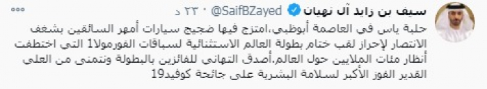 وقال في تغريدة على حسابه بموقع التدوين المصغر (تويتر)، اليوم، إن: "حلبة ياس في العاصمة أبوظبي، امتزج فيها ضجيج سيارات أمهر السائقين بشغف الانتصار لإحراز لقب ختام بطولة العالم الاستثنائية لسباقات الفورمولا 1 التي اختطفت أنظار مئات الملايين حول العالم".
