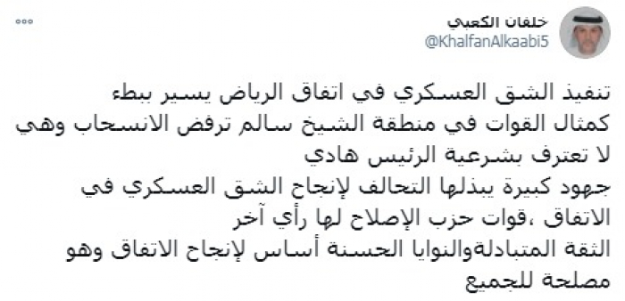 وأكد في تغريدة على حسابه بموقع التدوين المصغر (تويتر)، اليوم، أن: "تنفيذ الشق العسكري في اتفاق الرياض يسير ببطء كمثال القوات في منطقة الشيخ سالم ترفض الانسحاب وهي لا تعترف بشرعية الرئيس هادي"، مضيفا أن: "جهودا كبيرة يبذلها التحالف لإنجاح الشق العسكري في الاتفاق".