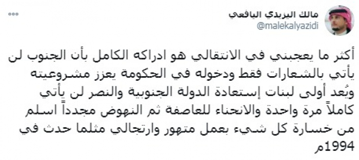 وكتب في تغريدة على حسابه بموقع التدوين المصغر (تويتر)، أن: "أكثر ما يعجبني في الانتقالي هو إدراكه الكامل بأن الجنوب لن يأتي بالشعارات فقط ودخوله في الحكومة يعزز مشروعيته ويُعد أولى لبنات استعادة الدولة الجنوبية".