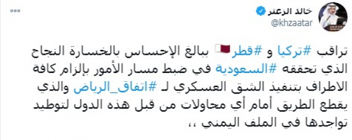 وأوضح في تغريدة على حسابه بموقع التدوين المصغر (تويتر)، أن: "تراقب تركيا وقطر ببالغ الإحساس بالخسارة النجاح الذي تحققه السعودية في ضبط مسار الأمور بإلزام كافة الأطراف بتنفيذ الشق العسكري لاتفاق الرياض".