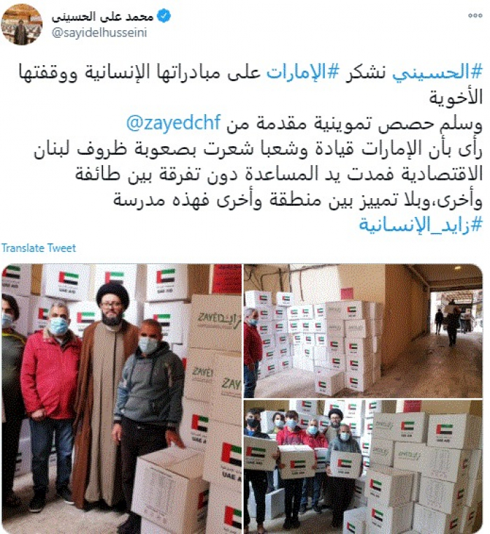 وقال في تغريدة عبر "تويتر" رصدها "المشهد العربي": "نشكر الإمارات على مبادراتها الإنسانية ووقفتها الأخوية وسلم حصص تموينية مقدمة من مؤسسة زايد للأعمال الخيرية رأى بأن الإمارات قيادة وشعبا شعرت بصعوبة ظروف لبنان الاقتصادية فمدت يد المساعدة دون تفرقة بين طائفة وأخرى، وبلا تمييز بين منطقة وأخرى فهذه مدرسة زايد الإنسانية".